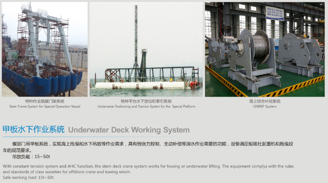 艉部門吊甲板系統(tǒng),實(shí)現(xiàn)海上拖曳和水下吊放等作業(yè)需求,具有恒張力控制、主動(dòng)補(bǔ)償?shù)壬钏鳂I(yè)需求的功能,設(shè)備滿足船級(jí)社起重機(jī)和拖曳絞車的規(guī)范要求。