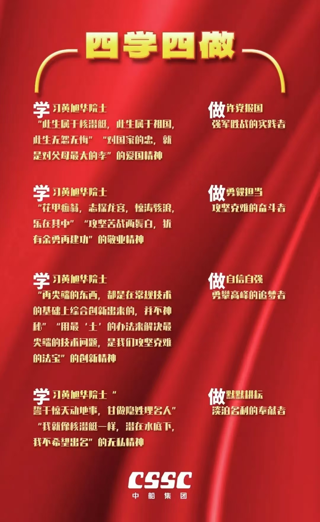 近日,中船集團(tuán)黨組下發(fā)通知,號召全集團(tuán)深入開展黃旭華院士先進(jìn)事跡“四學(xué)四做”活動。公司全體員工要深入學(xué)習(xí)宣傳黃旭華院士先進(jìn)事跡、優(yōu)秀品格和優(yōu)良作風(fēng),繼承黃旭華院士遺志,弘揚(yáng)核潛艇精神,賡續(xù)中船文化,在新時(shí)代新征程中,爭做對黨忠誠、對事業(yè)執(zhí)著的奮進(jìn)中船人,自覺將個(gè)人奮斗融入到中船集團(tuán)發(fā)展大局中,切實(shí)將學(xué)習(xí)活動成效轉(zhuǎn)化為完成全年任務(wù)目標(biāo)、推動“十四五”圓滿收官的實(shí)際成效。